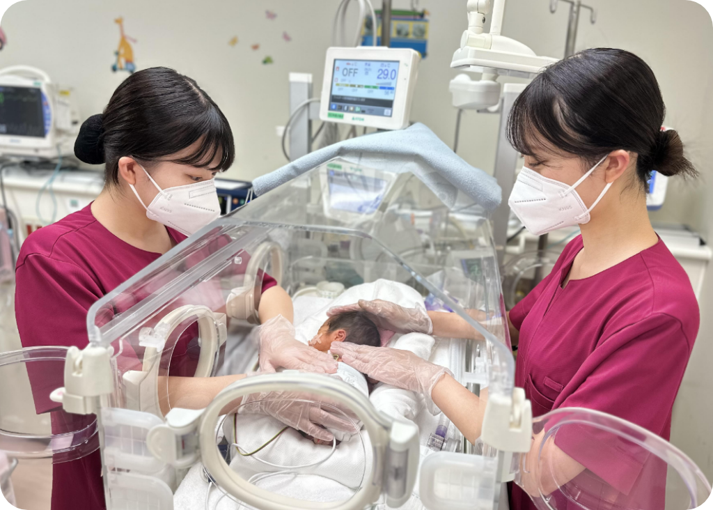 2011年1月の開設以来、近隣産婦人科からの母体搬送、院内および近隣産婦人科で出生した新生児の入院受け入れを積極的に行っています。赤ちゃんがお母さんのおなかにいる時から安全かつ最良の治療が提供できるように、産婦人科・小児科・小児外科の各診療科が24時間365日体制で連携して治療方針を決定しています。現在、新生児病棟にはNICU(新生児特定集中治療室)9床、GCU(新生児治療回復室)15床の計24床を有し、新生児診療を行っています。