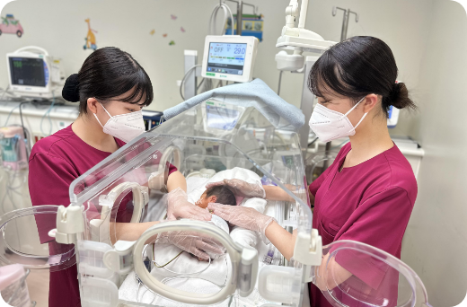 地域周産期母子医療センターとして、早産児(在胎22週~)や低出生体重児、疾患をもつ新生児などのハイリスク新生児を24時間体制で幅広く受け入れています。集中治療を担うとともに、医師や看護師、心理士など多職種がチームとなって赤ちゃんの成長発達を促進するためのケアや、親子の絆を育むための支援に取り組んでいます。