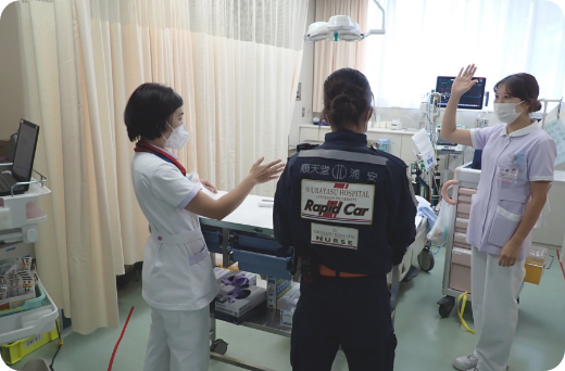 当院は浦安市にあり、千葉県内近隣地域の「救急医療の最後の砦」の医療施設としての役割を担っています。年間約5千台の救急車、約2万人の受診患者が来院します。各診療科の医師、様々な職種の人たちと連携を取りチーム医療を展開しています。消防からの要請により「心肺停止や重症な患者の治療をいち早く行う」ため医師、看護師が救急医療資機材を載せて現場に出動する緊急車(Rapid Response Car)の運用を行っています。高度救命救急センター外来は、患者、家族が安心して受診、治療が受けられるよう、患者さんに寄り添った看護、医療を提供しています。