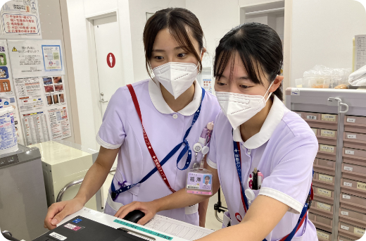 4D病棟は手術や化学療法目的とした患者さんが入院する外科系の混合病棟です。周手術期における術前・術後の管理を術式や患者さんの背景に合わせて看護を行っています。高度救命救急センターからの受け入れも多く、呼吸器の管理や熱傷・外傷などの患者さんもいます。突然の病気や交通事故により日常が変化した患者さんだけではなく、ご家族のサポートも心がけています。回復期には退院を見据え、希望する療養の場へ退院していけるように診療科とのカンファレンスでの情報共有や他職種と連携をして調整しています。また終末期には緩和ケアチームと連携して、痛みのコントロールだけではなく、その人がその人らしく最期をどのように迎えることができるのか、スタッフみんなで考え意思決定支援を行っています。